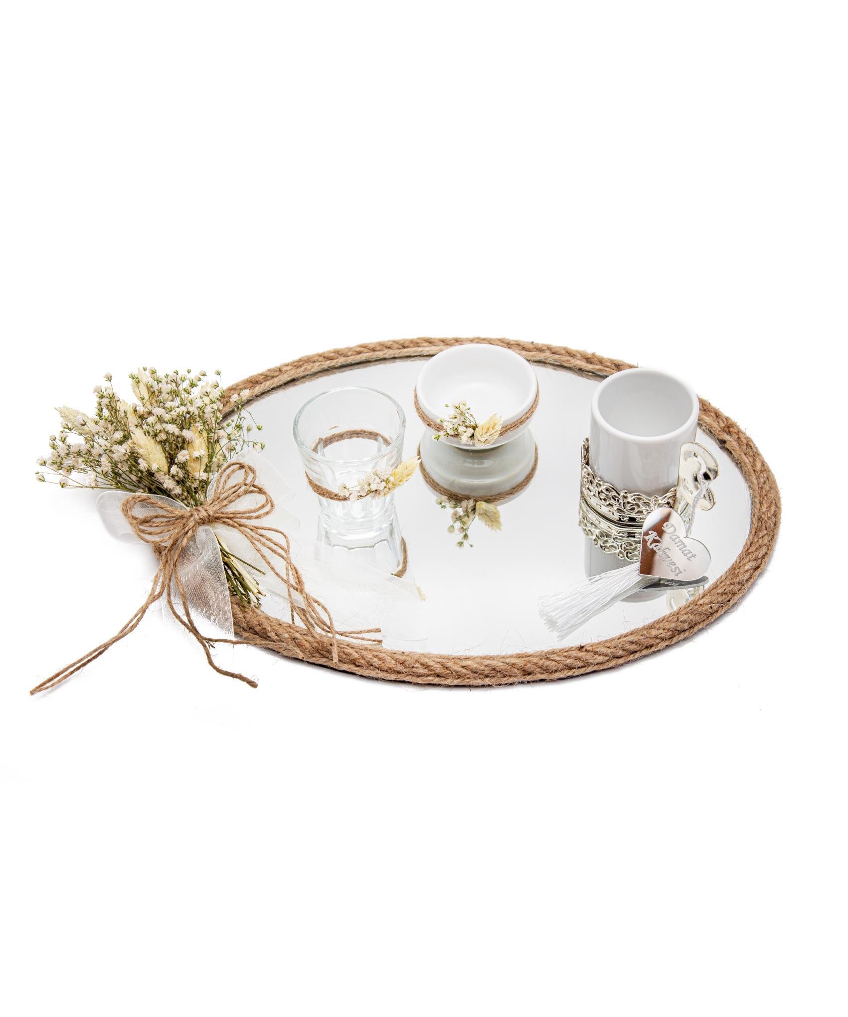 Tepsimiz 25cm x 35cm cm büyüklüğünde oval ayna üzerine üretilmiştir. Su bardağı, lokumluk ve kahve fincanı dahildir